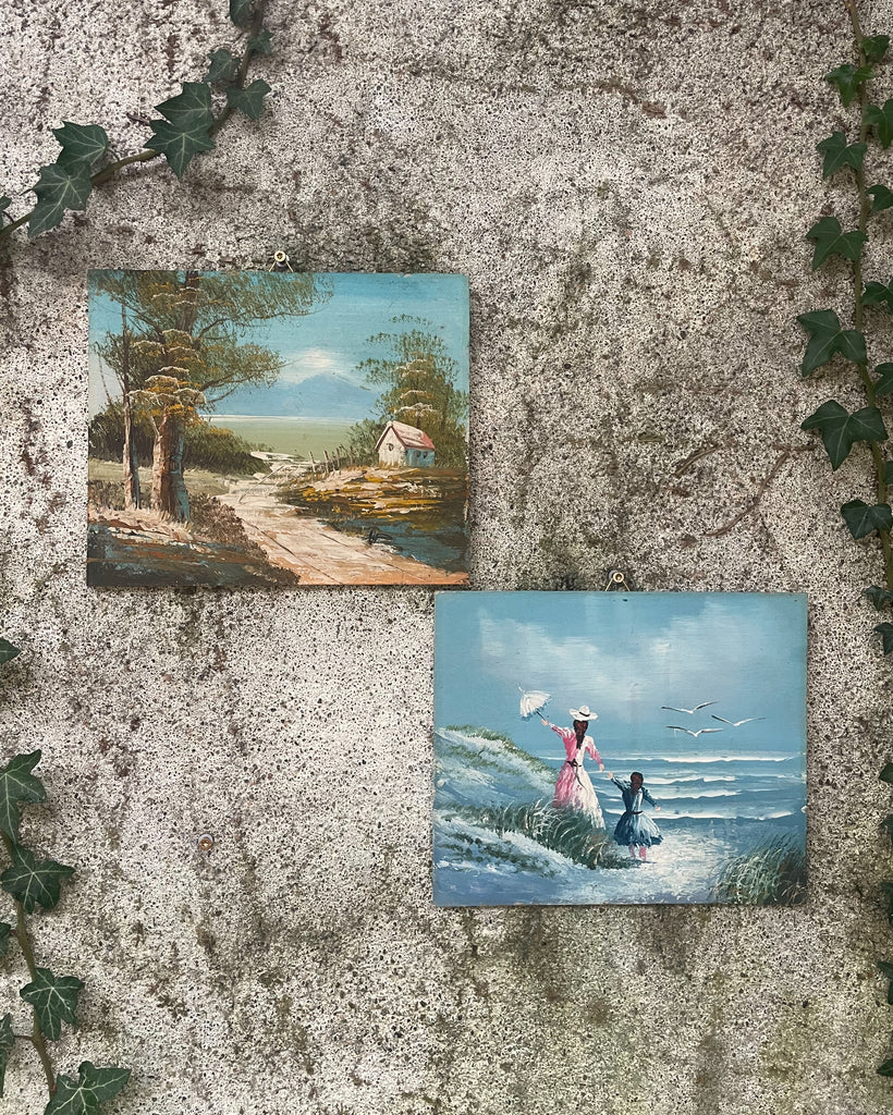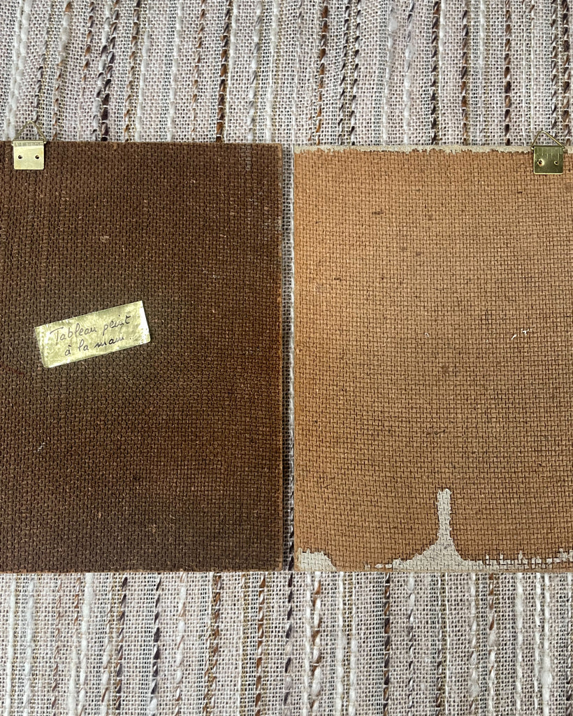 We vonden deze set van 2 prachtige handgeschilderde schilderijtjes in een heerlijk rommelwinkeltje in het zuiden van Frankrijk. De afmetingen zijn identiek en de kleuren zijn mooi helder. Mooi samen in een toilet of leeg hoekje, maar ook tof in combinatie met andere kunst. We hadden ze bijna zelf gehouden, deze fijne eyecatchers ;)