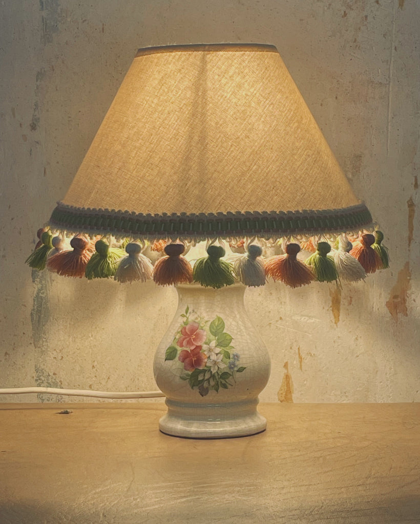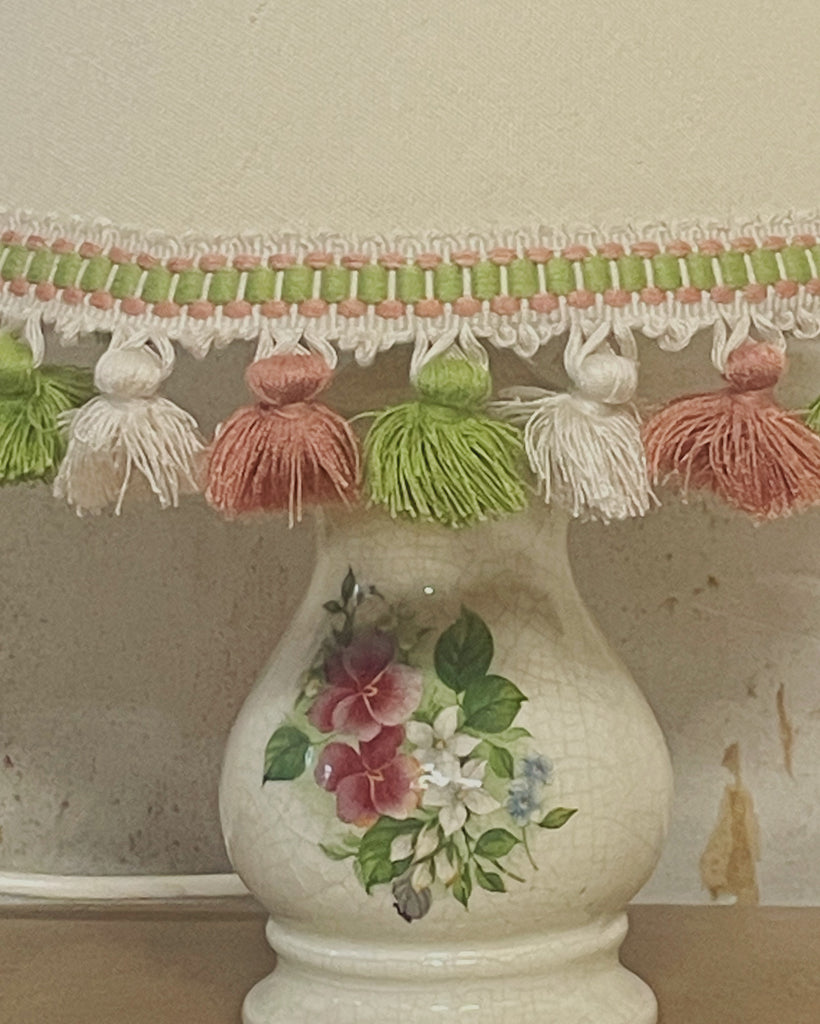 On adore les franges! We houden van franjes! En of ze nu aan fauteuiltjes, stoeltjes of lampenkapjes zitten maakt ons niet zoveel uit ;) Dit prachtige porseleinen tafellampje met een boeketje wilde bloemen op de voet geeft super veel sfeer aan de ruimte. Uniek en très français ;)