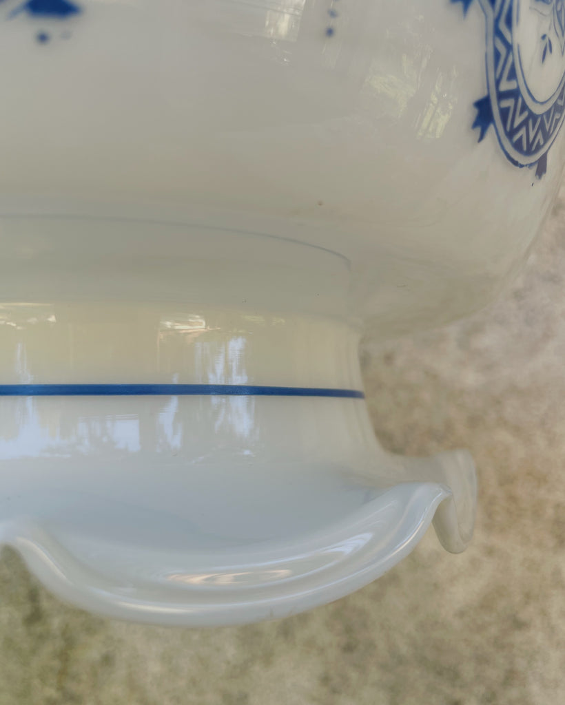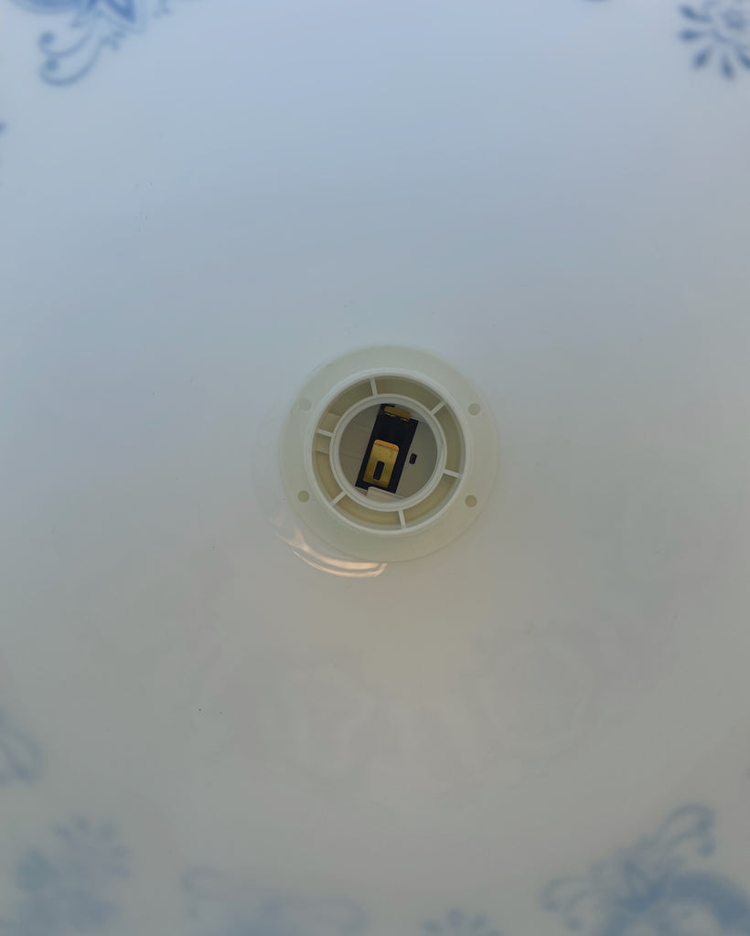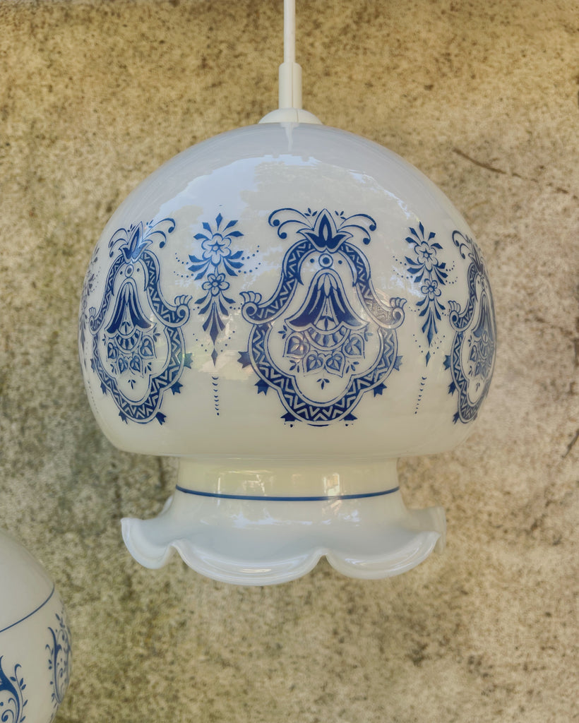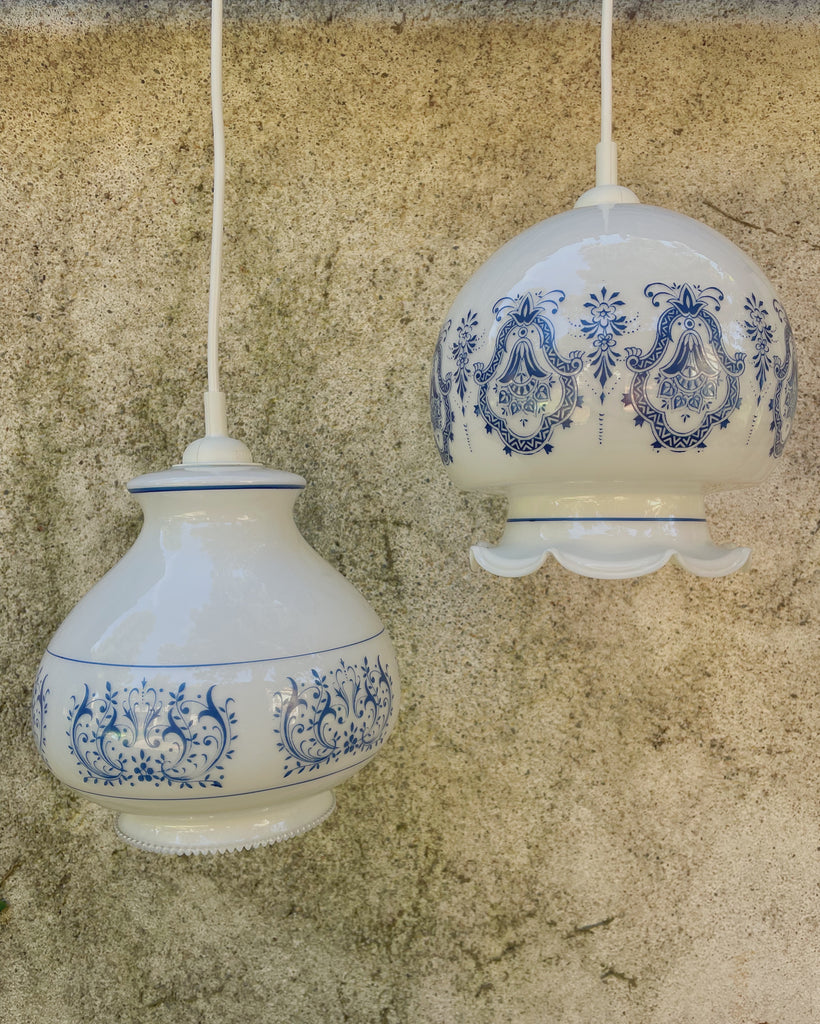 Sfeer gegarandeerd met deze fijne Franse lampenkapjes! Deze keer 2 unieke wit/blauwe kappen met mooi geschulpt randjes onderaan en een bijna Delfts blauwe print. We staan altijd op de uitkijk voor mooie unieke kapjes en vinden ze o.a. op vide greniers, in tweedehands winkels en kringlopen.